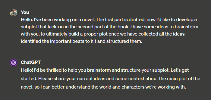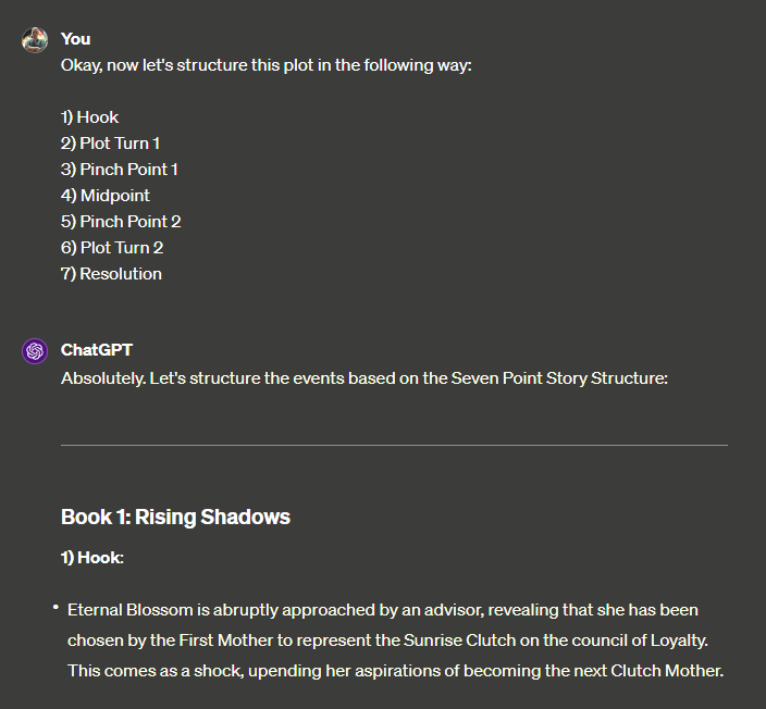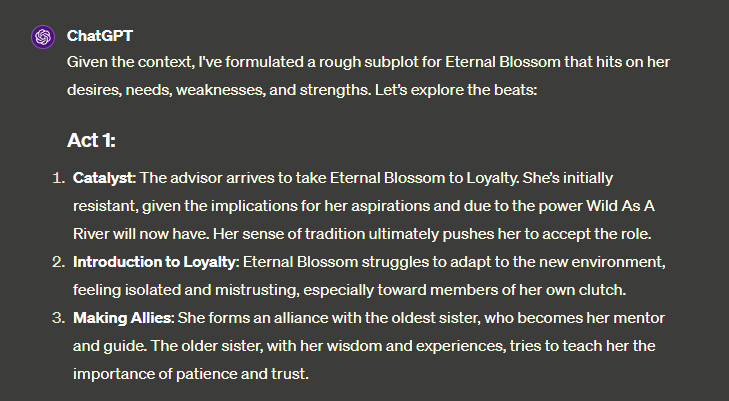 After I come up with a basic plot, I need to give it some structure. I use a variety of narrative frameworks, but for my current work in progress, I’m employing the “Save The Cat” method. ChatGPT helps me organize the story elements, making sure each plot point, character arc, and theme serves the story well. The AI’s grasp of narrative theory is incredibly valuable, making sure the story flows logically and keeps people engaged.