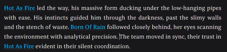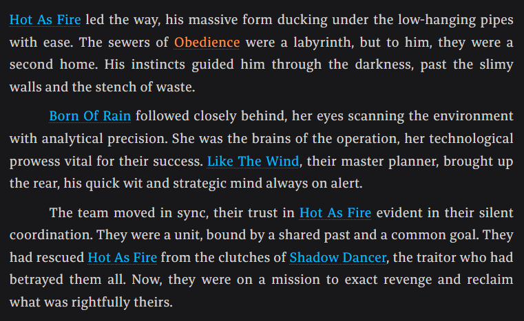 One issue with using AI for writing is keeping the voice consistent and making sure the story aligns with my vision. To sort this out, I regularly consult the world-building details and character profiles in NovelCrafter’s Codex. It keeps the narrative in line with the world and the characters. I need to find the right mix of the AI’s creativity and my authorial voice. AI already does this to some degree, using the Codex via RAG.