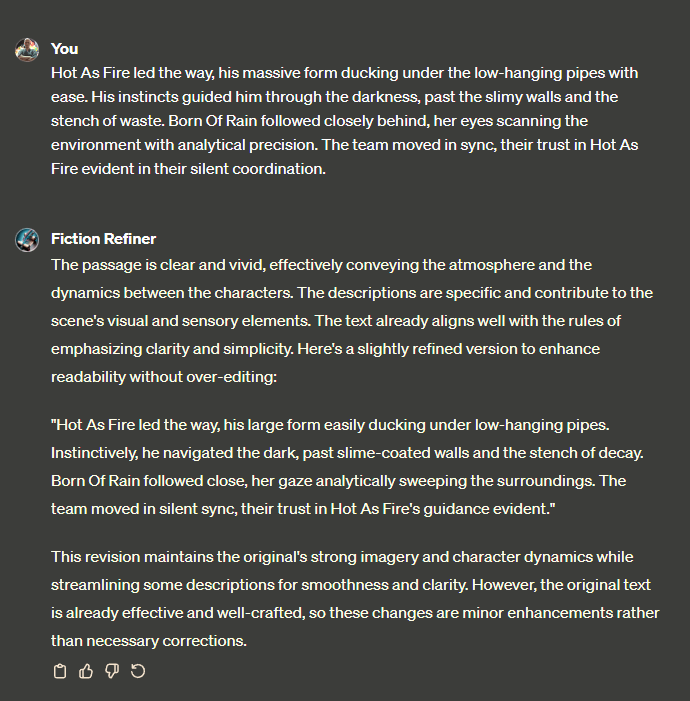 The initial part of my editing process involves cleaning up the text. I’ve got this custom GPT model that I trained for editing, and I use it to check the draft. This AI assistant isn’t only about finding grammar errors or typos, it’s also focused on flow, repetition, and awkward phrasing. It suggests changes that not only fix errors but also make the writing easier to read and better in quality.