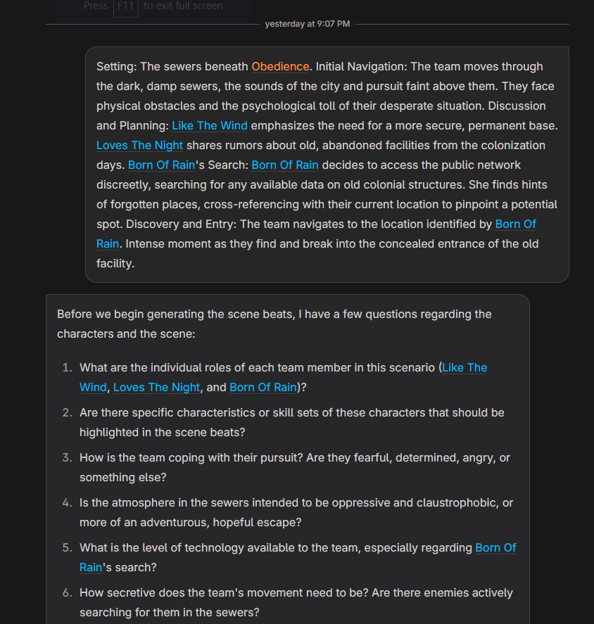 When I write with Airoboros, it’s more than just dictating to a machine. I’m in a creative discussion. I give it the scene beats and my starting narrative, and Airoboros takes it from there – expanding the story, throwing in dialogue suggestions, and even surprising me with its imaginative twists. It’s so great ’cause it’s not judgmental, so I can delve into themes and scenarios that other AI models might hold back on.