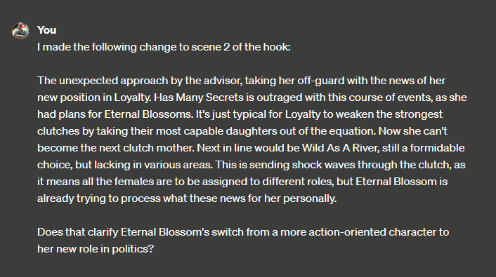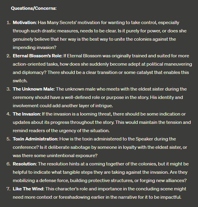 Once I’ve got the scenes outlined, I ask ChatGPT to take a look and tell me if there’s anything wonky going on, like plot holes, inconsistencies, or characters not acting like themselves. This is a really important part where the AI checks the story for anything that might mess it up.