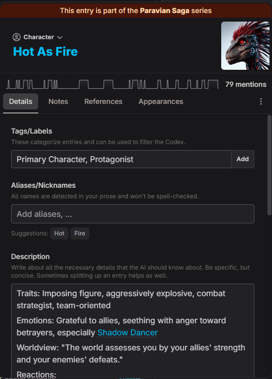 All the refined world-building elements are then transferred to NovelCrafter’s Codex, a “series bible”. The Codex isn’t just a static document, it’s integrated with the AI, assisting in the Retrieval-Augmented Generation (RAG) during the writing phase to ensure consistency and depth.