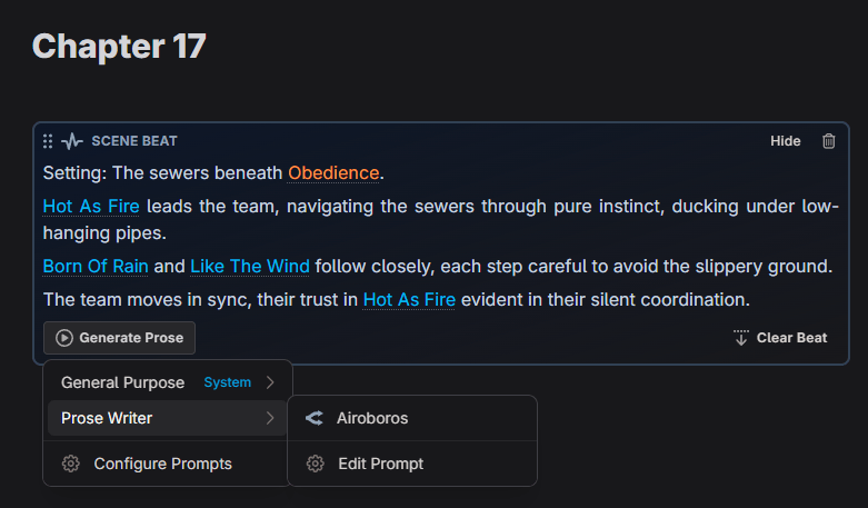 Every writing session begins with the scene beats I already planned in NovelCrafter. These beats act like a roadmap, making sure every scene has a purpose. I analyse the 12 beats and the actions I’ve laid out, imagining how the scene will go down and how the characters will interact.