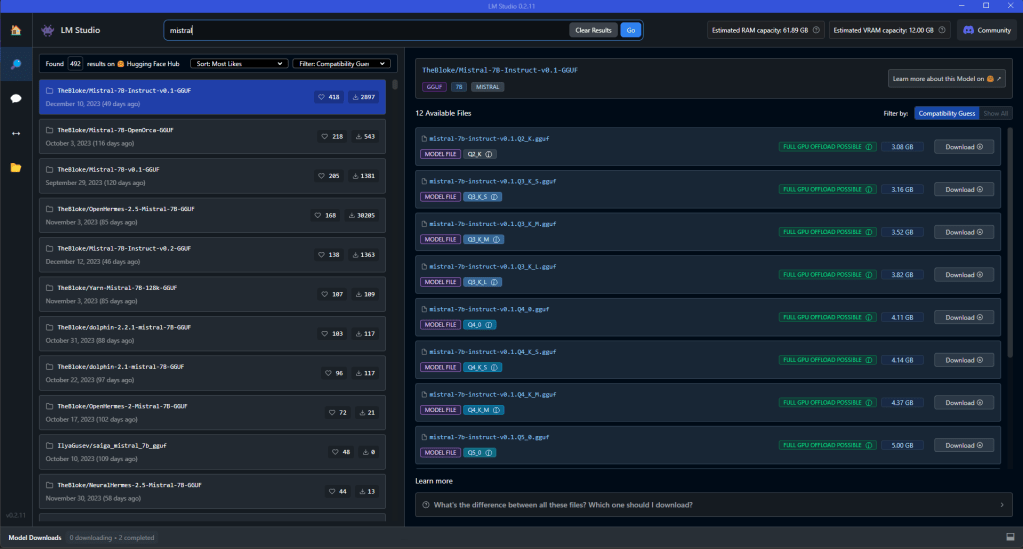 Why don’t we start with something small? You just want to mess around and see how this all works. Type “mistral” in the search box, and you’ll see a list of models. See if you can find a TheBloke/Mistral model. The very first one on the list is the one we’ll use for our test run.